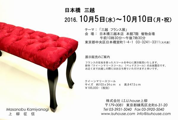 三越フランス展のご案内 日本橋三越本店 2016. 10月5日(水)~10月10日(月・祝)フランスの生地、特にダマスク柄の生地多く使ったスツールを中心に展示販売いたします。新作「クイーンマリースツール」(ベッドスツール)のお披露目です。お近くまでお越しの際にはお立ち寄りいただけますと幸いです。テーマ : 「三越 フランス展」会 場 : 日本橋三越本店 本館7階 催物会場 午前10時30分~午後7時30分 東京都中央区日本橋室町1-4-1 03-3241-3311(大代表) こちらもチェック快晴の朝 日本橋三越本店本日3日目。壁面にもディスプレイ。エスカレーターから良く見えます。午後から会場におります。...日本橋三越本店 スツール等 展示販売のご案内Girl's Tea Party 日本橋三越本店はなばな祭 日本橋三越本店新作です。コンパクトなサイズのコンパクト。手の平サイズのマカロンです。日本橋三越本店5階、...